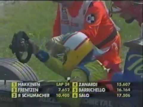 Reprisbilderna visar att japanen i Arrows-bilen låste bromsarna, klättrar ovanpå Badoers Minardi Cosworth och gjorde att den sistnämnde fått bryta sitt hemma-GP på samma område där Mika Häkkinen fått stopp i maskineriet några varv senare.
